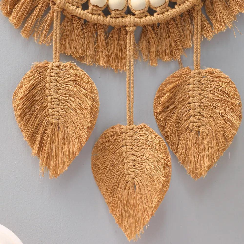 El intrincado diseño de macramé que rodea el espejo crea un punto focal cautivador. Los delicados patrones anudados a mano exudan una sensación de profundidad y textura, proyectando hermosas sombras que bailan por la habitación cuando la luz las incide.